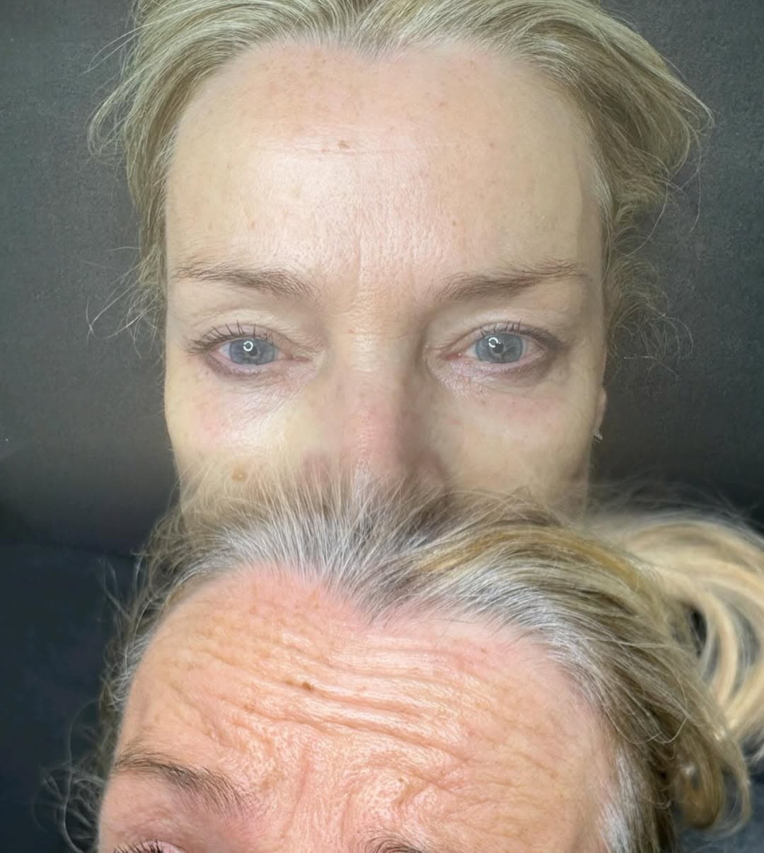 We use the same ring light and room lighting for both photos. Shadows can be manipulated to hide hollows or wrinkles, so consistent lighting is key to showing the truth.